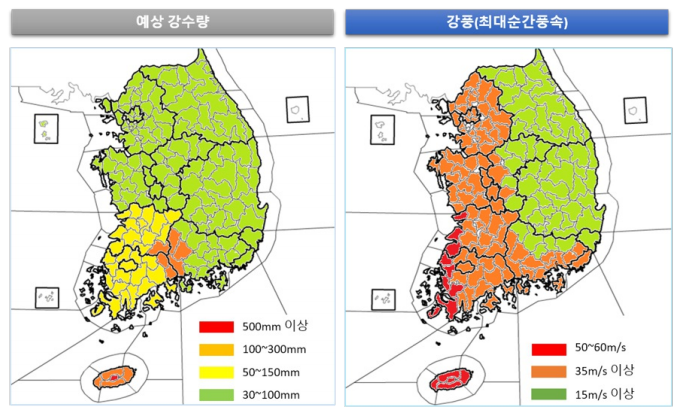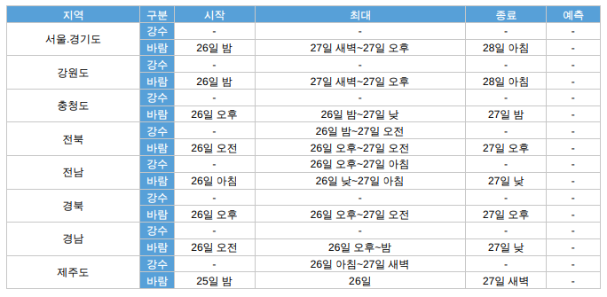 태풍이 점차 북상함에 따라 24일 제주도를 시작으로 26일에 남부지방, 27일 새벽에 전국으로 비가 확대되어 28일 오전까지 이어지겠다. 태풍의 영향을 가장 강하게 받는 시기는 26일 오후~27일로 예상된다. 태풍의 이동경로에 가깝고 지형의 효과를 가장 많이 받 는 제주도와 지리산 부근은 최대 300mm 이상(제주산지 500mm 이상), 전라도 최대 150mm의 매우 많은 비가 내리겠고, 그 밖의 전국은 30~100mm의 많은 비가 예상되니, 저지대 침수 및 하수 범람 등에 각별히 유의해야 한다.