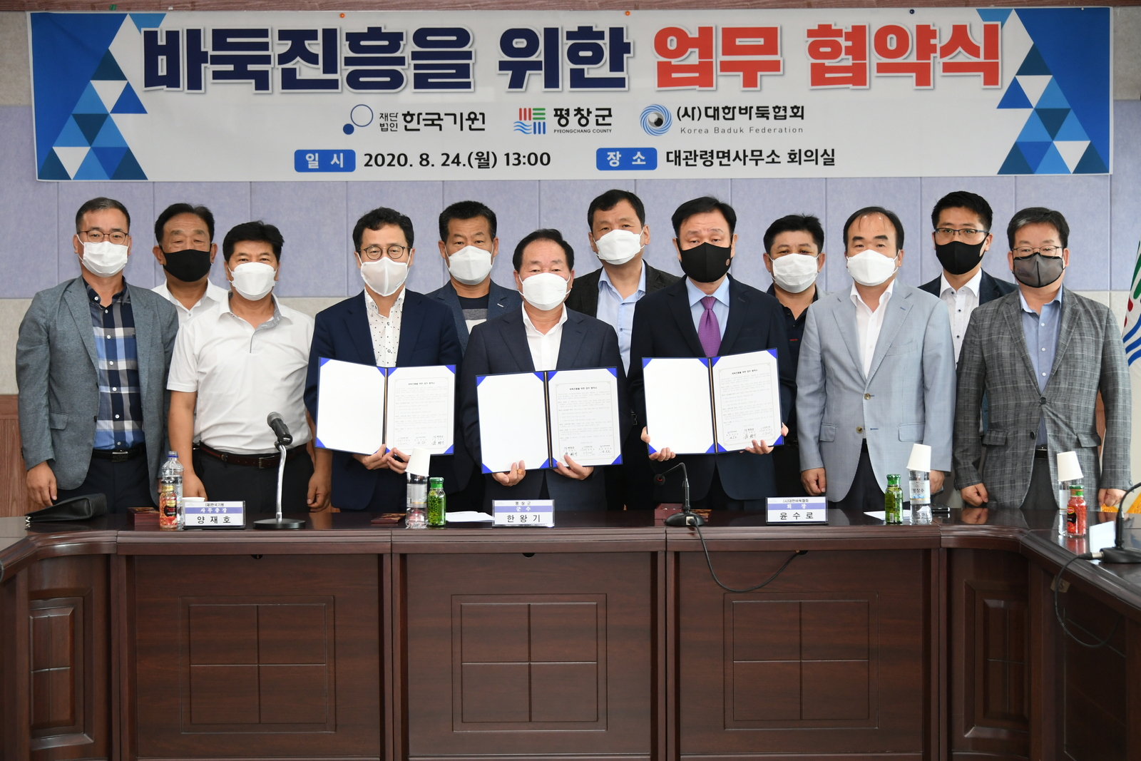 평창군은 24일 오후 1시에 대관령면사무소 회의실에서 ()한국기원 및 ()대한바둑협회와 바둑을 통한 국민 체육복지 증진을 실현하고자 업무협약을 맺었다.