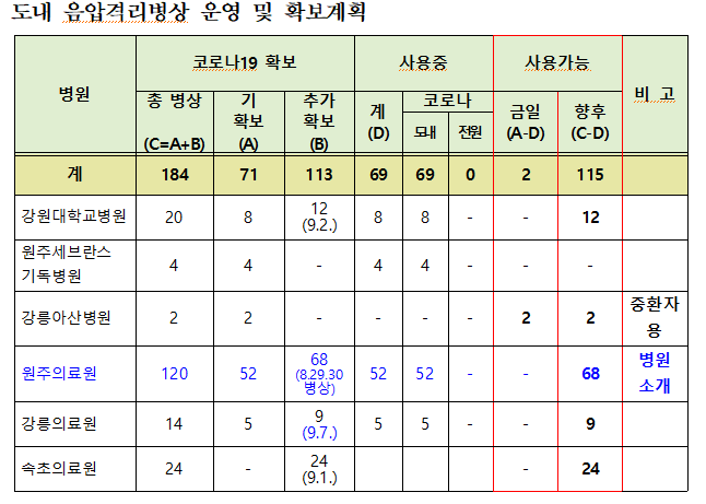 도는 원주지역 환자 증가로 음압병상 가동률이 100%를 상회함에 따라 825일부터 원주의료원의 감염병 전담병상을 전격 확대 운영하기로 결정하고 현재 52병상으로 운영 중인 음압격리병상을 120병상까지 확대하여 운영할 계획이다.
