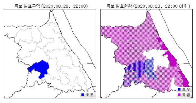* 주요지점 1시간 강수량 현황(28일 19시 50분부터 20시 50분까지, 단위: mm) - 대화(평창) 29.5 청일(횡성) 13.5 면온(평창) 4.5