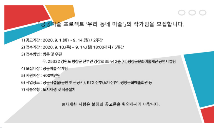 평창군 & 평창군문화예술재단, 공공미술 프로젝트 '우리 동네 미술' 작가팀 공모