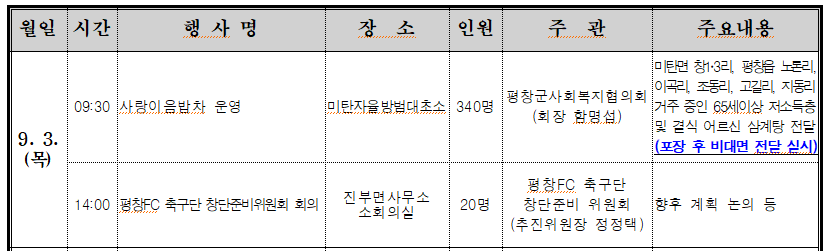 ○ 오늘(9.3.) 평창FC축구단 창단준비위원회(추진위원장 정정택)는 진부면사무소 소회의실에서 향후 추진계획에 대해 논의할 예정.