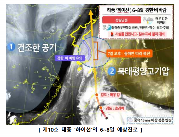 1제10호 태풍 하이선(HAISHEN)은 중국에서 제출한 이름으로 바다의 신을 의미한다. 우리나라 서쪽에서 접근하는 차고 건조한 공기와 동쪽에 위치한 북태평양고기압의 세력에 따라 태풍의 진로와 강도가 매우 유동적이다다.