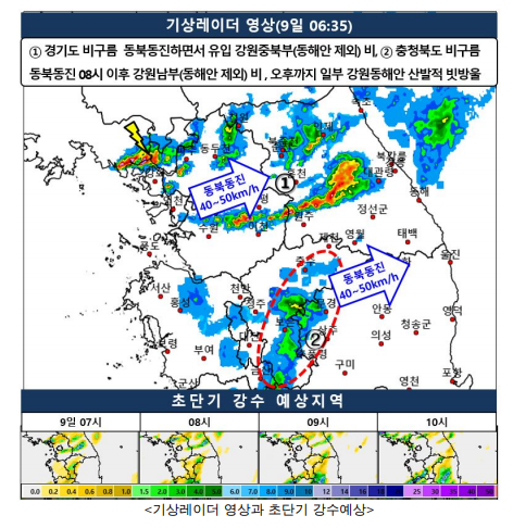 한편, 충청북도에 위치한 위치한 비구름(②)은 동북동진함에 따라 08시 이후부터 강원영서남부(영월, 정선)와 태백에 비가 내리겠다.