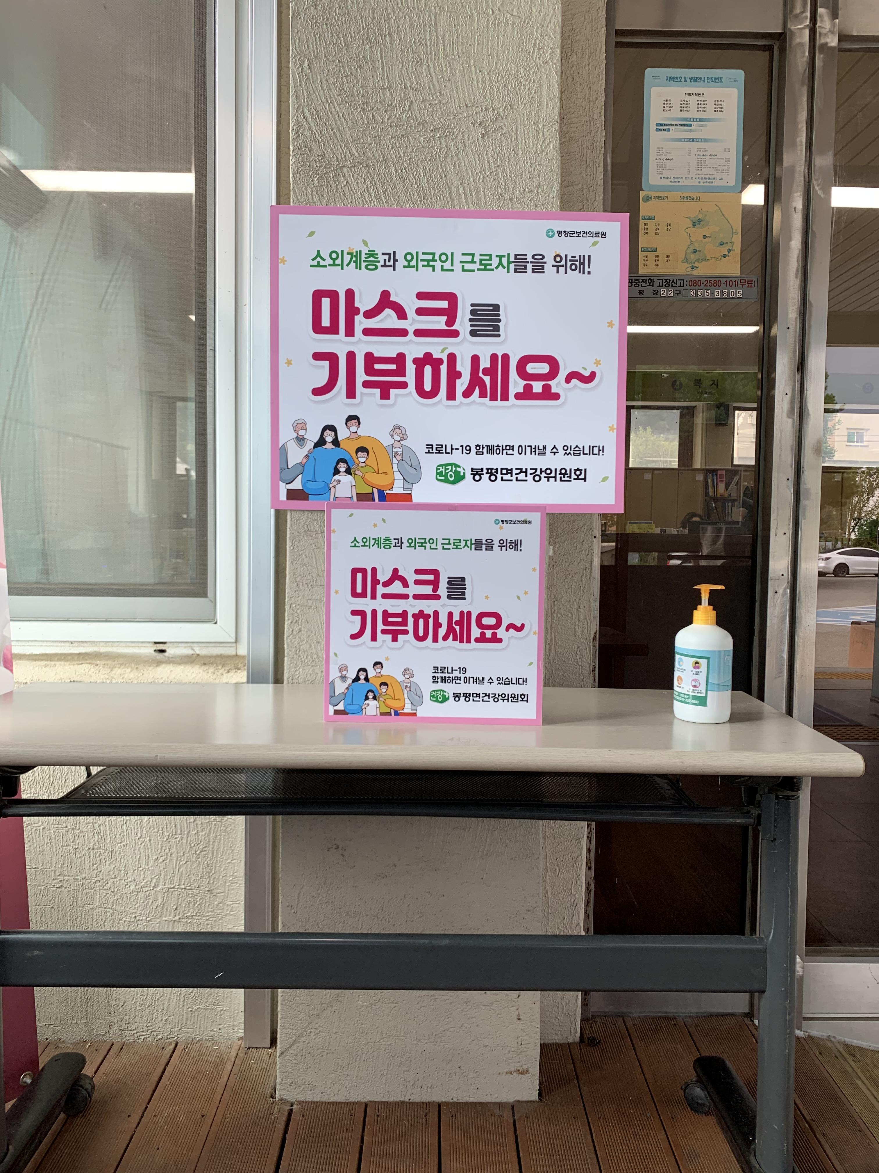 봉평면 건강위원회는 농사일을 위한 일손으로 해외에서 입국한 외국인 근로자의 활동이 늘어남에 따라 코로나19에 대한 지역주민의 불안함을 낮추고 사용하지 않고 있는 천 마스크의 기부를 통해 나와 이웃의 건강을 지키고자 캠페인을 시행했다.