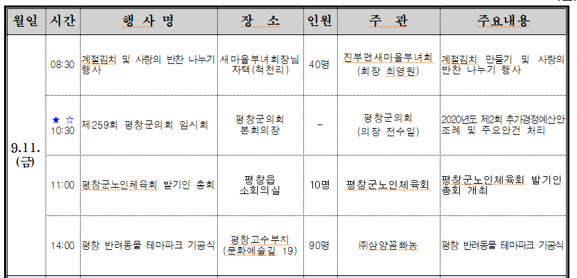 ○ 오늘(9.11) 08:30 진부면새마을부녀회(회장 최영원) 회원 40명은 척천리의 새마을부녀회장님 자택에서 김치 및 반찬을 만들어 지역의 소외계층 주민에게 전달할 예정.