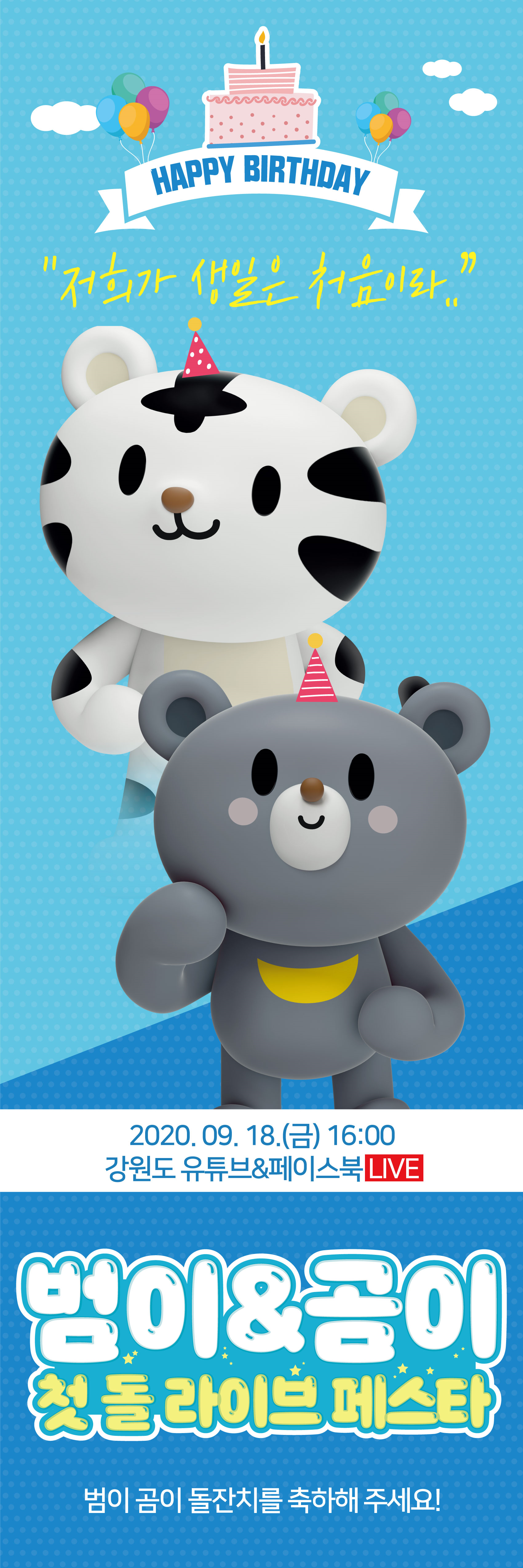 강원도는 “강원도 캐릭터인 범이&곰이의 첫돌을 맞아 생일 이틀 전인 9월 18일 오후 4시 도청 분수광장에서 「범이&곰이 첫돌 라이브 페스타」를 개최한다.”고 밝혔다. 행사명에는 범이&곰이의 첫 생일을 온라인으로나마 다함께 즐길 수 있는 축제의 형태로 진행하고자 하는 의미를 담았다.