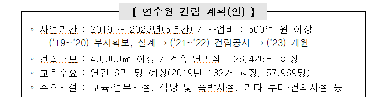 건강보험심사평가원 교육연수원은 올해까지 부지 및 예산을 확정하고, 2022년까지 공사를 마치고 2023년 개원을 목표로 하고 있다.