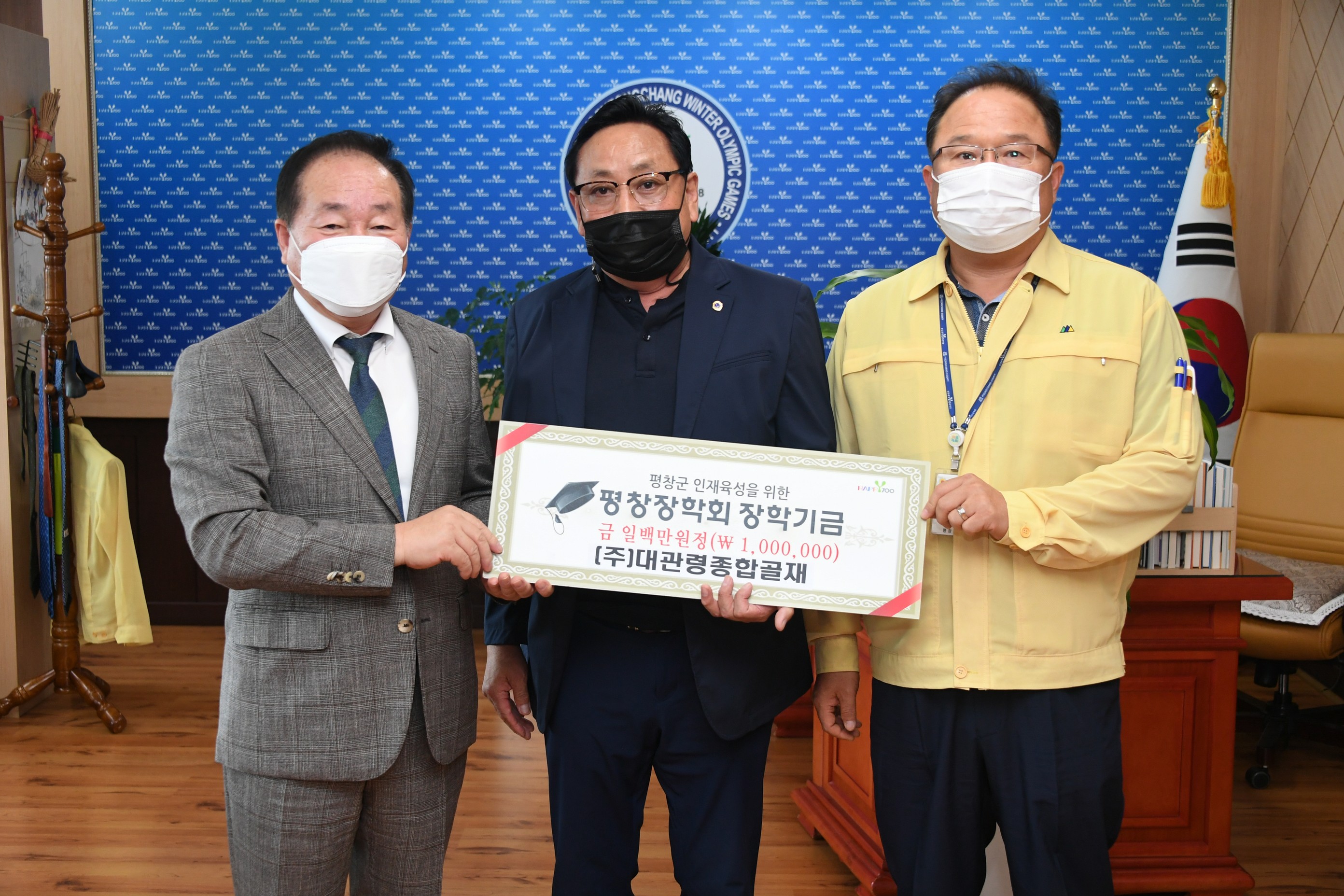㈜대관령종합골재(대표 유봉근)는 9월 25일(금) 평창군청을 방문하여 평창장학회에 장학금 100만원을 기탁했다.