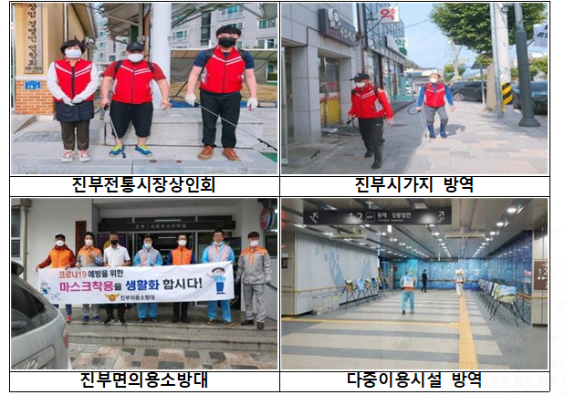추석연휴 전인 지난 9.29일부터 추석연휴 기간인 10. 4일까지 진부전통시장상인회(회장 송경수)와 진부면의용소방대(대장 이문재)는 추석 명절을 맞아 코로나 19 대비 진부시가지 및 다중이용시설 방역활동을 실시했다.