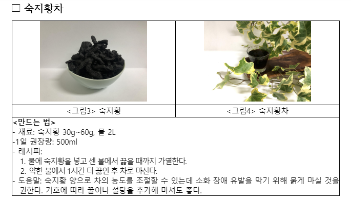 숙지황= 성질은 약간 따뜻하고 맛이 달다. 간, 신장 기능이 저하돼 생기는 증상을 치료하며 혈액을 포함한 체액을 보태주므로 보약으로 쓰이는 경우가 많다.