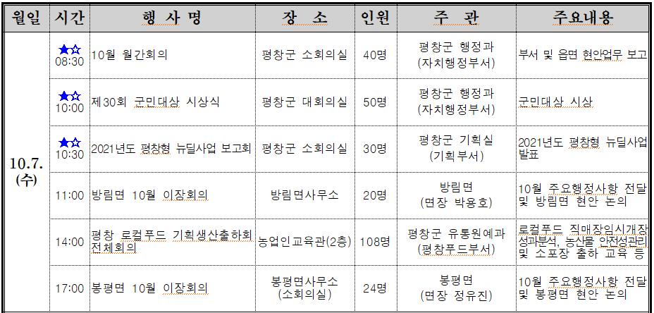 2020년 10월 7일 평창군 주요동정