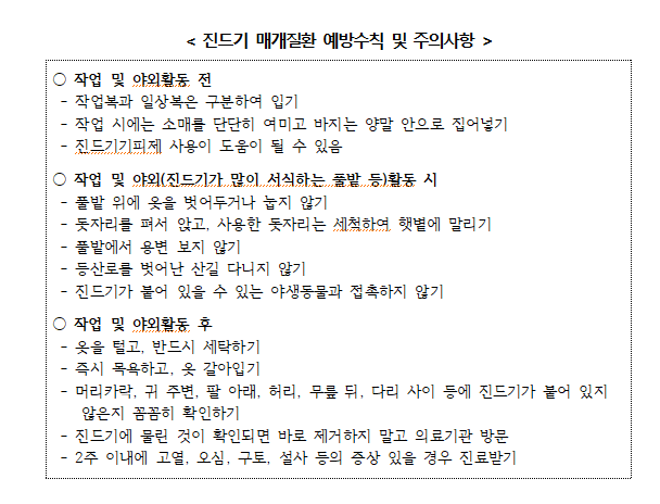 가을철 수확 활동 및 산행(단풍 나들이) 등 풀숲이나 덤불 등 진드기 서식 장소로 들어갈 때는 반드시 긴 소매, 긴 바지, 목이 긴 양말 착용하여 진드기 침투 가능성을 최소화 하고, 4시간에 한번씩 진드기 기피제 사용하며, 야외활동 후에는 반드시 샤워와 입던 옷은 세탁하여야 한다.