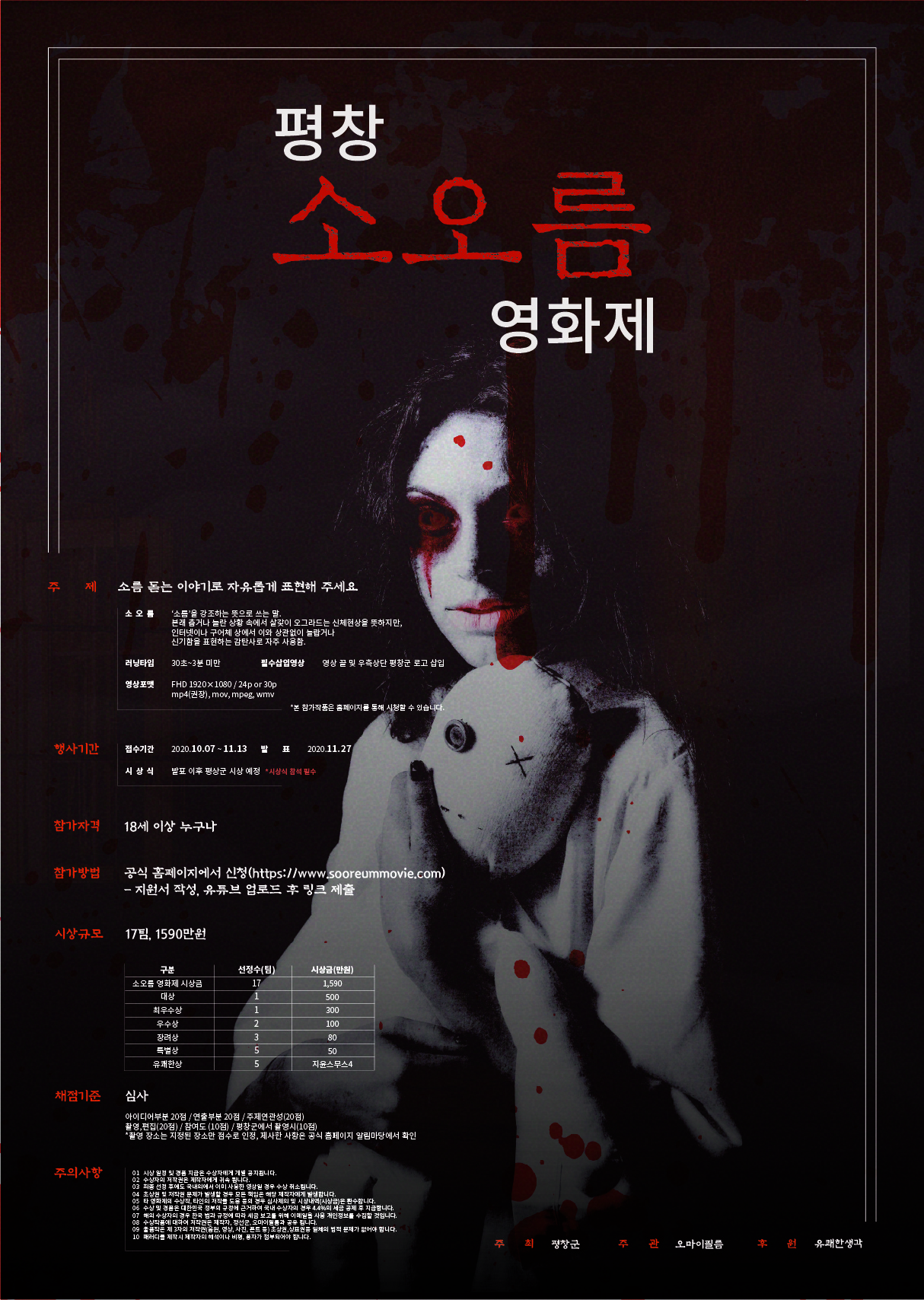 평창군이 주최하고 ㈜오마이필름(신보석 대표)이 주관하는 평창 소오름영화제는 전문가나 기관 등 제공자가 아닌 일반 사용자가 콘텐츠를 직접 제작하는 UCC 전국 공모전으로 응모 희망자는 2020년 10월 7일(수)부터 11월 13일(금)까지 공식 홈페이지(www.sooreummovie.com)를 통해 소름 돋는 평창 이야기를 영상으로 제작하여 응모하면 된다.