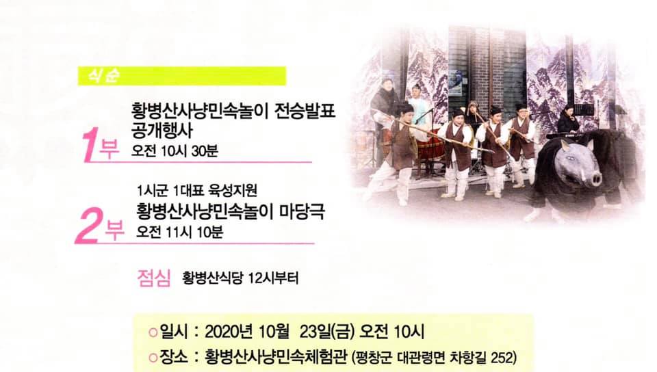 한편, 2007년 강원도무형문화재 제19호로 지정되어 올해로 13년째 이어오고 있는 평창황병산사냥민속놀이는 정초에 신성한 마을 제사인 서낭제에 쓸 제물을 위해 멧돼지 사냥을 한 것에서 유래 되었으며, 특히 2018평창동계올림픽대회 기간 공연을 펼쳐 전 세계인의 호응을 얻은 바 있다.