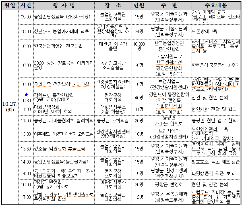 오늘(10.27.) 16:00, 평창군 번영회는 미탄면사무소 대회의실에서 읍면 번영회장 등 20명이 참석한 가운데 10월 정기 이사회를 개최하여 주요 행정사항을 전달하고 현안 및 안건을 논의할 예정.