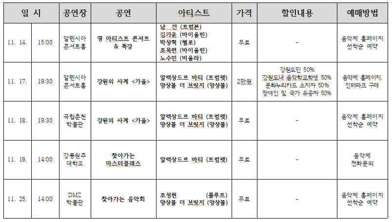 강원의 사계 <가을> 중 강원인재육성재단과 함께하는 <영 아티스트 콘서트> (11월 14일 오후 3시 알펜시아 콘서트홀), 국립춘천박물관 로비에서 열리는 <알렉상드르 바티와 앙상블 더 브릿지 공연> (11월 18일 오후 7시 30분), 고성 DMZ 박물관에서 열리는 <조성현(플루트)과 앙상블 더 브릿지 찾아가는 음악회> (11월 25일 오후 2시) 모두 무료로 진행될 예정이며 10월 29일부터 음악제 홈페이지 등을 통해 사전예약을 시작할 예정이다. (티켓 및 무료 공연 사전예약 문의: 033-240-1363, 02-725-3395)