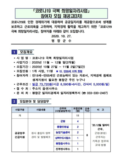 - 참여자격: 만18세 ~ 만55세 근로 능력이 있는 평창군 주민