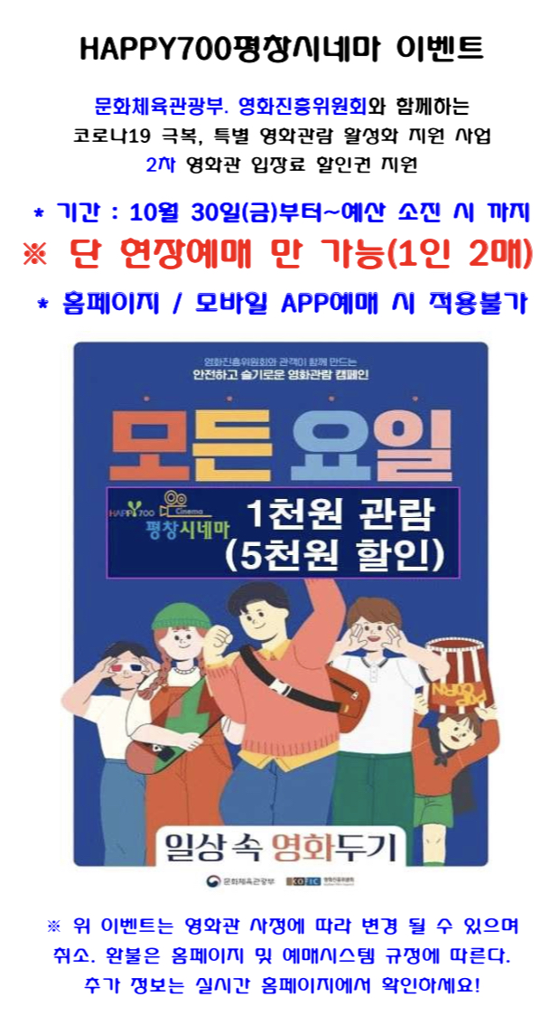 평창군 작은영화관 ‘HAPPY700 평창시네마’는 영화진흥위원회에서 추진하는 ‘2차 영화관 입장료 할인권 지원사업’을 10월 30일(금)부터 재개한다.