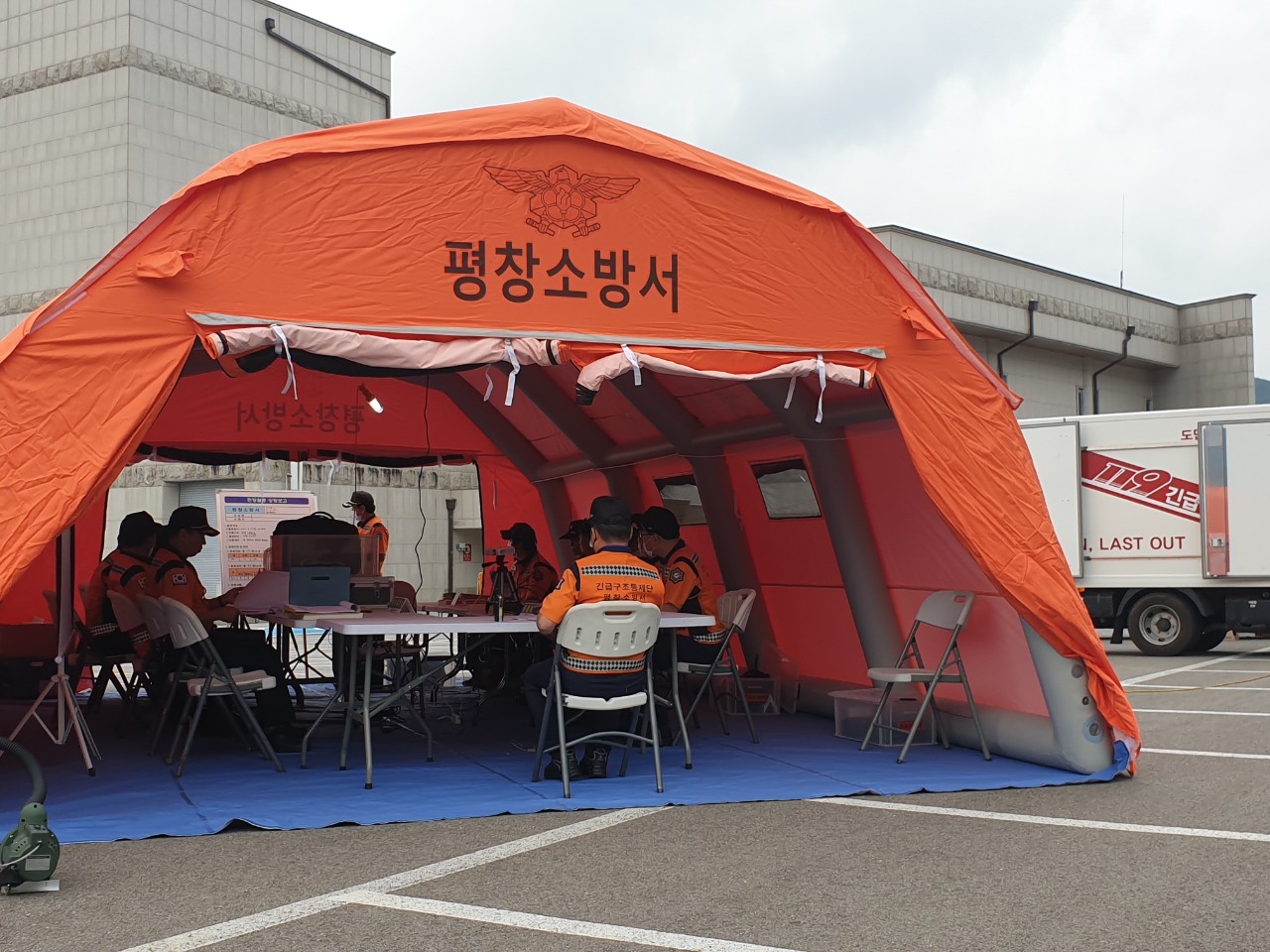 이날 훈련은 평창올림픽시장에서 원인미상의 화재로 다수사상자가 발생하여 긴급구조통제단이 가동된 상황을 가정해 진행됐다.