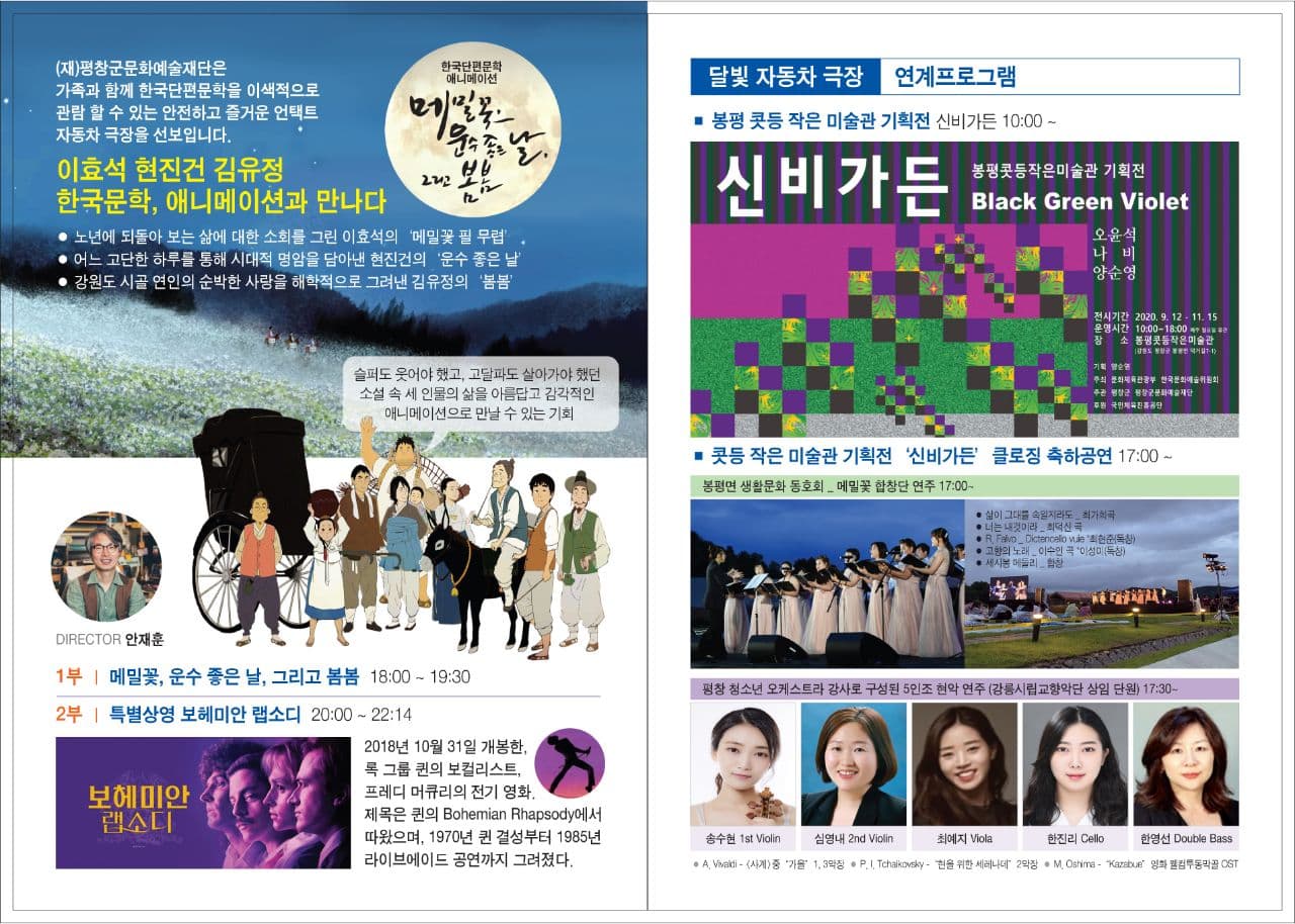 (재)평창군문화예술재단(김도영 이사장)은 오는 14(토) 17시 봉평 달빛생활문화센터에서 달빛 자동차 극장을 개최한다. 한국 단편 문학을 이색적으로 관람할 수 있는 안전하고 즐거운 언택트 자동차 극장을 선보인다. 상영되는 작품은 (사)평창국제평화영화제가 제공하는 이효석의 메밀꽃 필 무렵, 김유정의 봄봄, 현진건의 운수 좋은 날을 애니메이션 한 작품이다. 애니메이션을 제작한 안재훈 감독은 대한민국 스튜디오 제작 시스템을 도입해 “치유의 힘이 있는 그림, 감동이 있는 빛깔”이라는 가치 아래 작품을 만들고 있는 ‘연필로 명상하기’의 애니메이터이다.