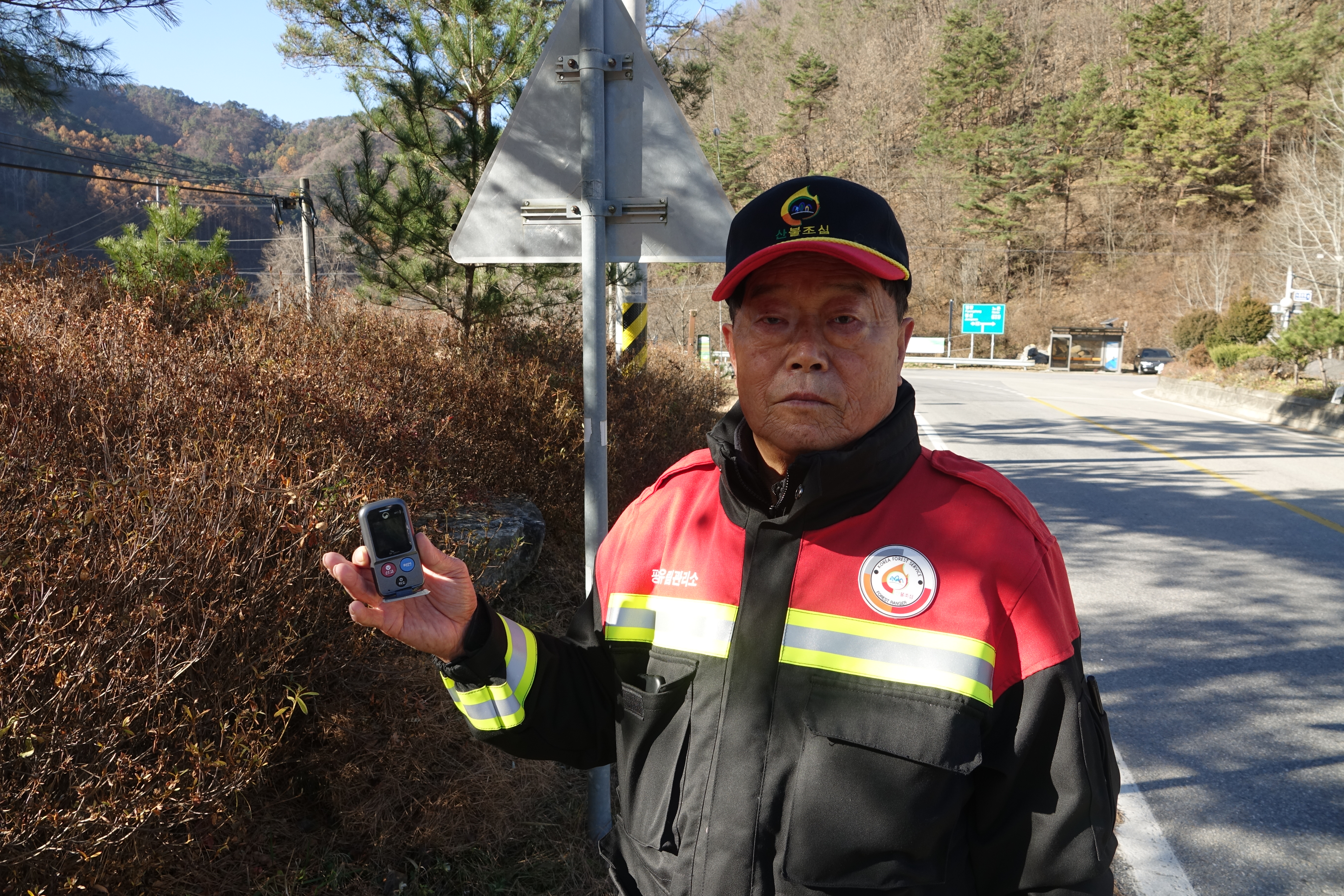 산불이 났을 때는 이 GPS의 신고 버튼을 누릅니다. 그러면 제가 있는 위치에서 산불이 발생했다고 통합관제센터에서 국유림관리소, 산림청, 소방서, 경찰서, 군부대 등 유관기관에 자동으로 연락이 갑니다.