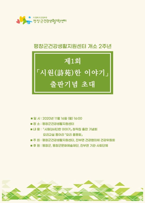 평창군건강생활지원센터는 1116() 오후 4시 평창군건강생활지원센터에서 지역 어르신들의 동시 창작집 어디쯤 오니의 발간을 기념하는 1회 시원(時苑)한 이야기 출판기념회를 개최했다.