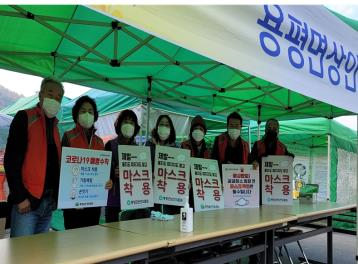 용평면과 용평면 건강위원회(위원장 김낙현)는 장평5일장 평화시장에서 코로나19 마스크착용 캠페인과 마스크 나눔 봉사를 진행했다.