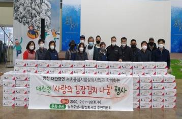 대관령농촌중심지활성화사업추진위원회(위원장 박정우)는 어울마당에서 ‘사랑의 김장김치 나눔’ 행사를 진행했다. 이날 행사에는 박정우 위원장을 비롯해 면사무소직원 및 대관령면 사회단체장 등이 모여 약 20여명은 500여 포기의 김장김치를 만들었으며, 완성된 김치는 대관령 내 도움이 필요한 180가구에 전달 할 예정이다.