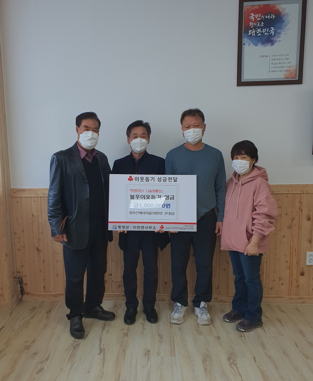 미탄면 회동2리 청옥산깨비마을(대표 권대섭)은 미탄면 사회보장협의체를 통해 불우이웃을 위한 성금 100만원을 전달했다. 이번에 기탁한 성금은 지난 2020년 제3회 “아름다운 농촌마을 가꾸기 경진대회”에서 전국 176개의 참여마을 중 대상(1위)에 선정되어 받은 시상금을 기탁했다.