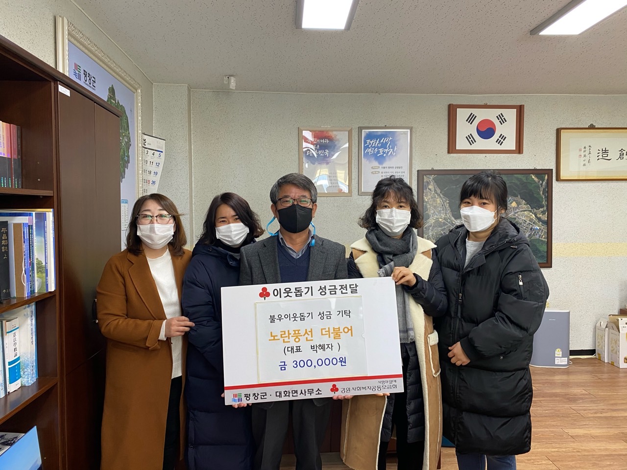 대화면건강위원회의 재능봉사동아리 노란풍선 더불어’(회장 박혜자) 회원 4명은 대화면사무소를 방문하여 희망2021나눔캠페인으로 불우이웃돕기 성금 30만원을 기탁했다.  노란풍선 더불어17명의 회원으로 구성되어 풍선아트를 주로 재능을 기부하고 있으며 특히, 4년째 어린이들을 위하여 대화면 내 어린이집에 풍선아트 봉사를 실시하고 있다.