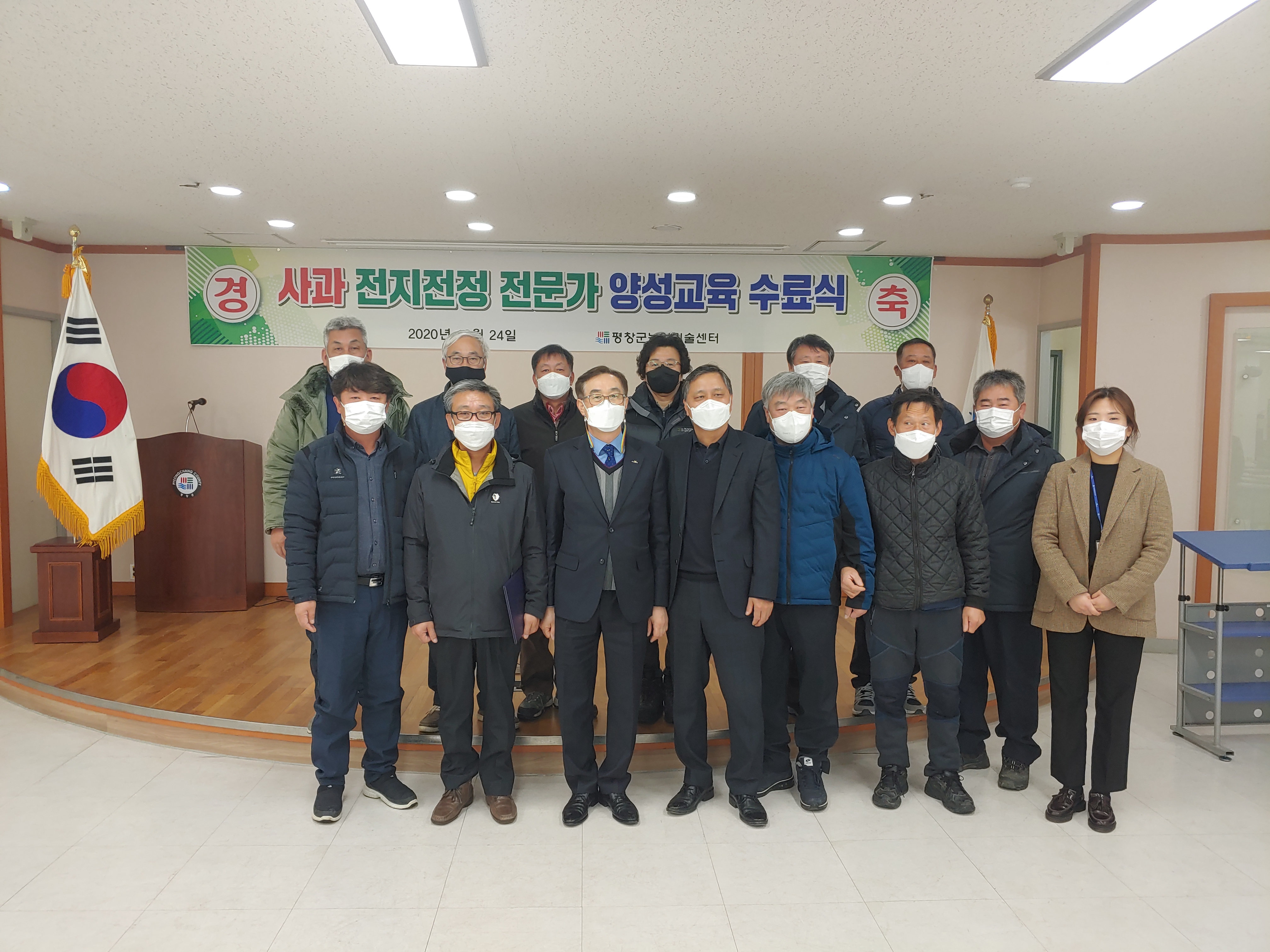 평창군농업기술센터는 12월 24일(목) 농업기술센터 대회의실에서 사과전지전정전문가 양성교육 수료식을 가졌다.