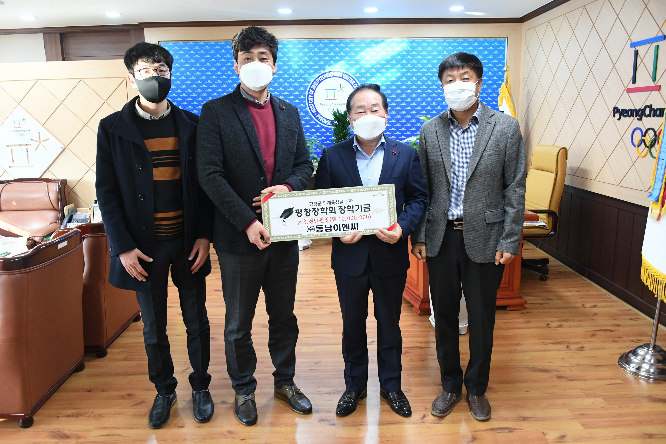 동남이엔씨(대표 박주현)는 12월 28일(월) 평창군청을 방문해 지역인재 육성을 위한 장학금 1,000만원을 평창장학회에 기탁했다.