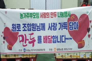()농가주부모임대화분회(회장 유선자)에서는 연말을 맞아 추운 겨울을 따뜻하게 보내시길 바라는 마음으로 71세이상 원로조합원 343분께 각각 직접 빚은 손만두30개와 라면3봉지를 포장하여 전달했다. 이번 사랑 나눔 행사는 ()농가주부모임대화분회에서 주관하고 대화농협과 평창군지부에서 후원하여 진행되었으며, 코로나19 사회적거리두기 방역수칙을 철저히 준수하며 진행하였다.