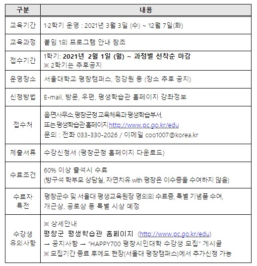 2018년부터 시작된 HAPPY700평창 시민대학은 주민들의 수요에 맞춘 다양한 강좌와 서울대학교 교수들의 전문성 있는 강의로 큰 호응과 만족을 얻었으며, 올해는 코로나19대비 온·오프라인을 병행, 주민들의 다양한 교육수요에 맞춰 12개 과정들로 시민대학을 구성해 운영할 계획이다.