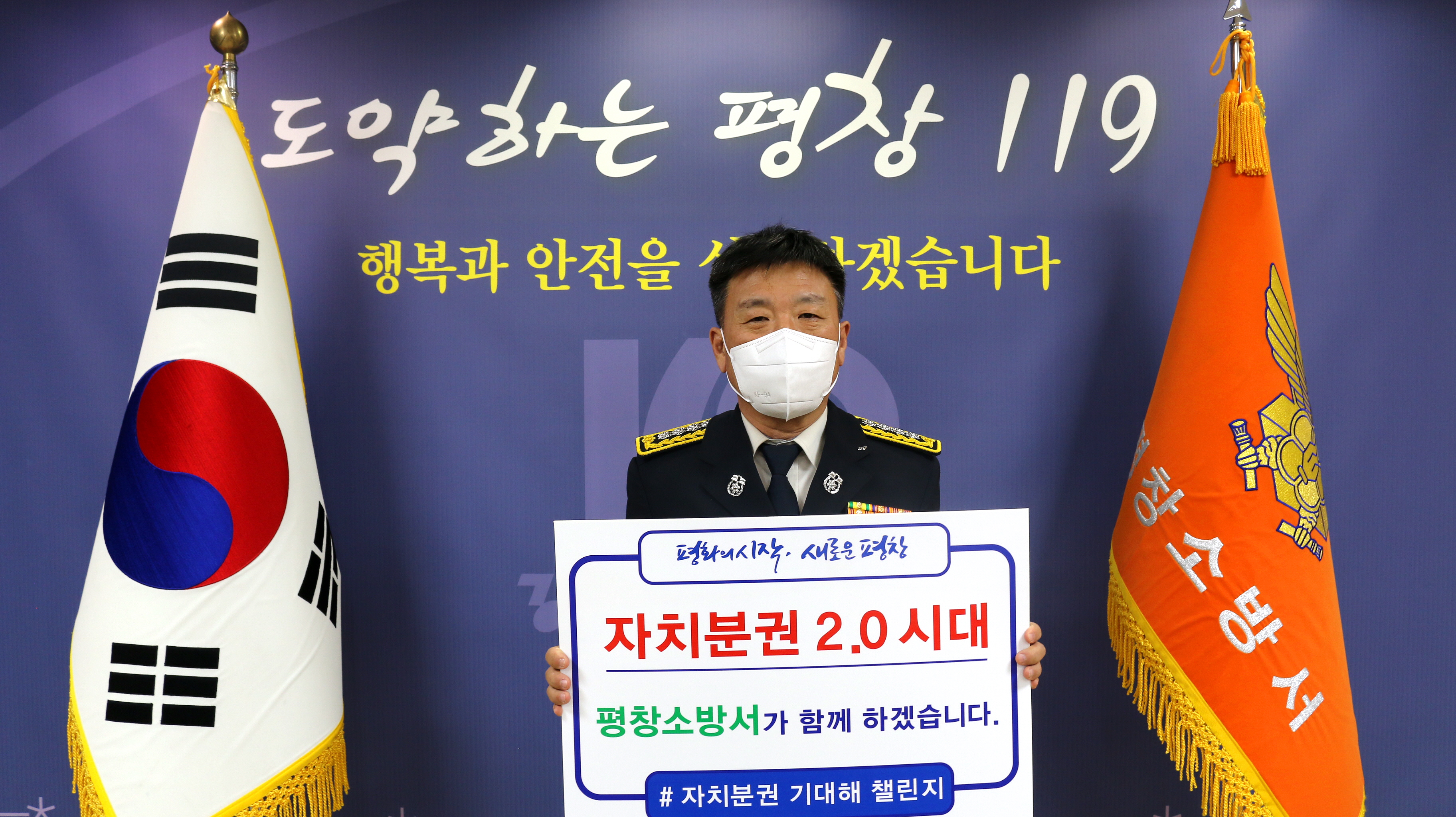 남종훈 서장은 “자치분권 2.0시대, 평창소방서가 함께 하겠습니다.”라는 메시지를 전하며 자치분권 2.0시대 개막을 응원하였다.