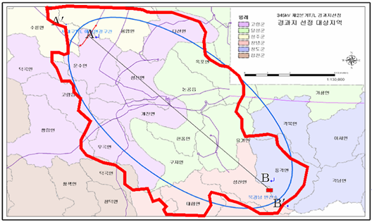 "건설예정 송전선로의 시점(A)과 종점(B)을 직선(AB)으로 연결하고 그 직선의 양끝을 각 각 1km씩 연장하였을때 (A,B), 그 연장선(A‘,B’)을 장축으로 하는 타원형(횡축은 중축의 2/3)에 해당되는 지역 중 전체 읍․면 면적의 30% 이상이 포함된 지역은 대상지역에 포함시키고, 시점과 종점이 포함된 읍․면은 30%이하가 포함된 지역이라도 반드시 대상지역에 포함시키도록 한다. 또한 대상지역에 포함된 지역이라도 자연지형으로 인해 시점에서 송전선로가 연결될 수 없는 지역이라든지 법적 제한요건이 있는 지역으로 둘러싸여 있을 경우에는 대상지역에서 제외할 수 있다."