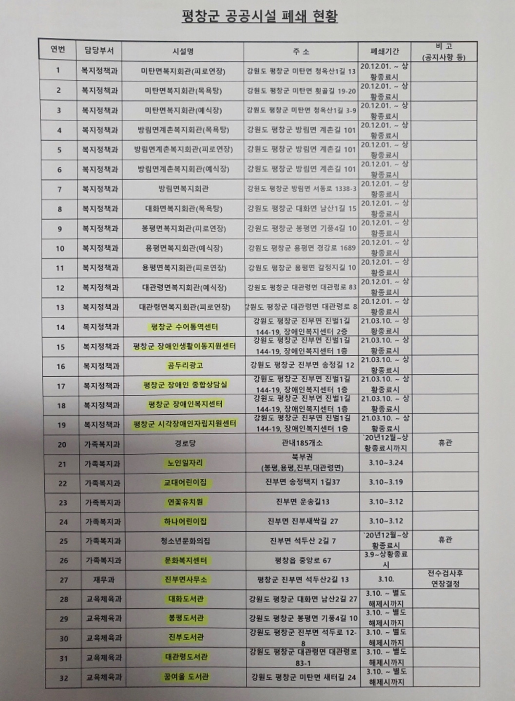 아울러, 이번 코로나 상황에 대한 강도 높은 대응을 위해 진부면의 공공시설은 사태가 진정될 때까지 잠정 폐쇄할 예정이며, 진부면 내 5개 학교에 대해 금일부터 12일까지 학생들의 등교를 중단하고 원격수업을 진행하도록 조치하였습니다.