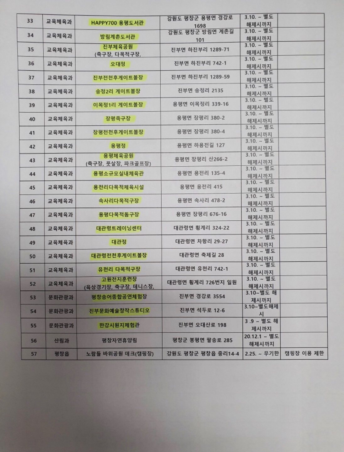 한편 평창군은 진부면 지역주민 전체에 대하여 코로나19 전수검사를 시작했다. 지난해 12월 대관령면 지역에 이어 두 번째로 진부면 지역에 대하여 전수검사를 실시하고 있다.