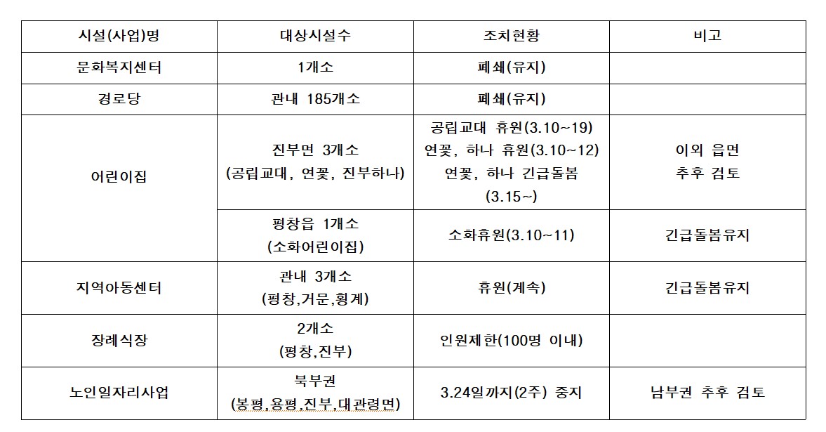 아울러, 이번 코로나 상황에 대한 강도 높은 대응을 위해 진부면의 공공시설은 사태가 진정될 때까지 잠정 폐쇄할 예정이며, 진부면 내 5개 학교에 대해 금일부터 12일까지 학생들의 등교를 중단하고 원격수업을 진행하도록 조치하였습니다.