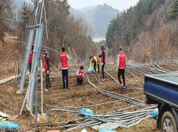 ○ 지난(3.21.) 용평면 청년회(회장 심인하)는 회원 26명과 함께 대설피해 이목정리 한 농가에 비닐 하우스(1동) 철거 지원을 실시하였음.