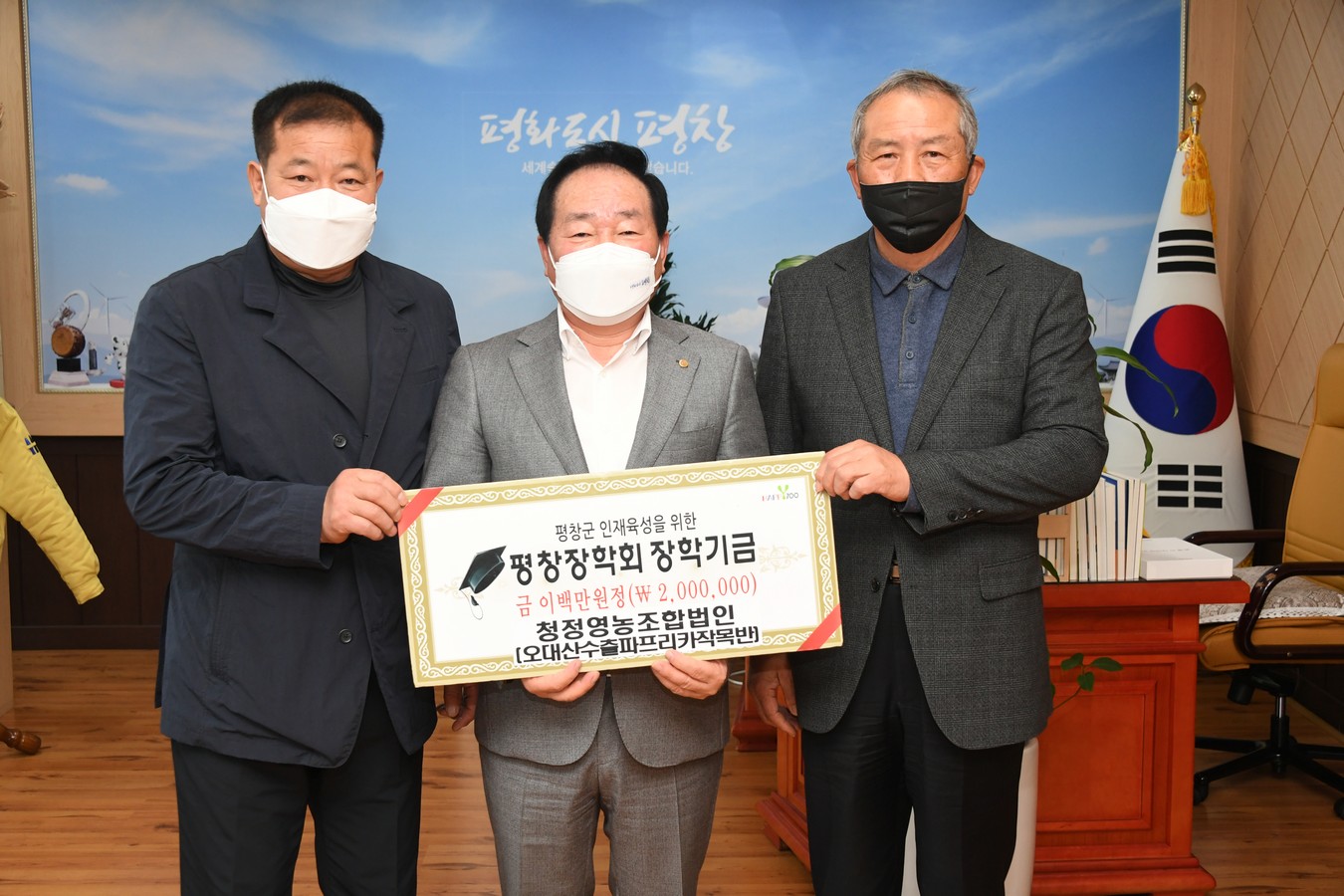 청정영농조합법인은 진부면의 파프리카를 재배하는 10여 농가들로 이루어져있으며, 지역의 미래를 이끌어갈 인재육성을 위한 장학금 기탁의 뜻을 모아 이번 장학금을 기탁을 하게 되었다.
