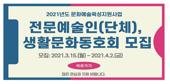 생활 예술인 육성사업은 3백만 원 한도에서 문학, 시각, 공연 등 모든 장르의 생활예술동호회 및 아마추어 예술단체 발표와 활동을 지원한다.