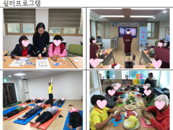 쉼터프로그램은 신체활동. 인지훈련, 공예활동, 도예활동, 원예활동, 요리활동, 아로마테라피 등 대상자의 능력과 흥미를 고려한 구조화된 인지자극프로그램이 제공된다.
