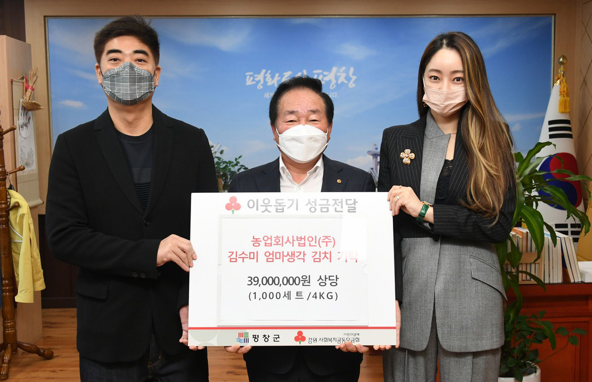 이와 함께, 농업회사법인 주식회사 김수미엄마생각김치는 이날 39백만원 상당의 김치 4kg 1,000세트를 어려운 이웃에게 전해달라며 평창군에 기탁하였다.