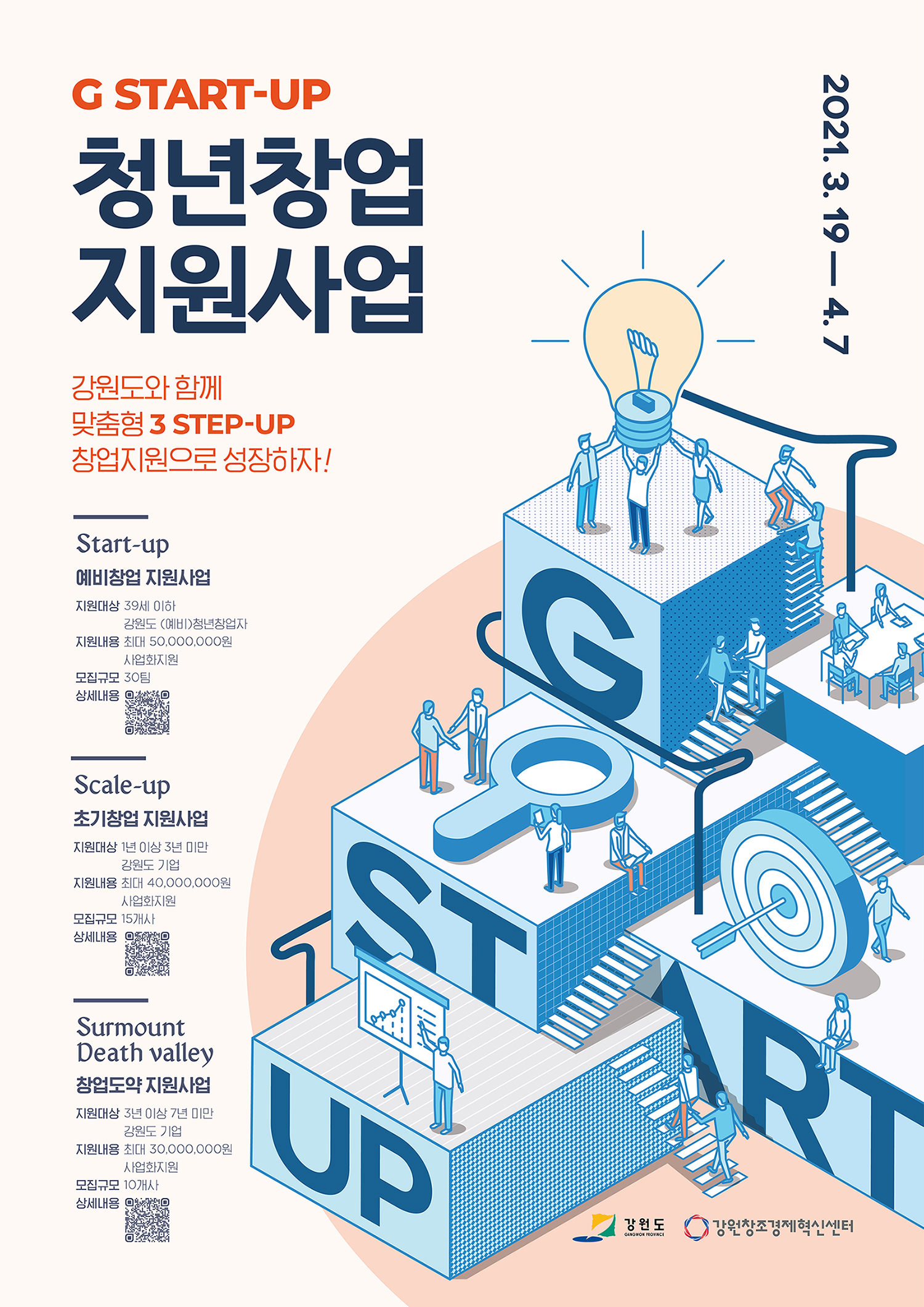 강원창조경제혁신센터(센터장: 한종호, 이하 ‘강원혁신센터’)는 ‘2021년 G-스타트업 청년창업 지원사업’에 참여할 우수한 (예비)창업기업을 4월 7일까지 모집한다고 밝혔다.