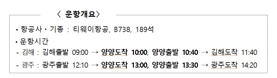 강원도 관계자는 이번 김해ㆍ광주노선 재 취항으로 강원도민과 부산ㆍ광주시민의 교통편의 제고와 양양공항 활성화에 기여할 것으로 예상되며, 죽도해변, 설악산 등 공항인근 시ㆍ군에도 관광객들이 많이 방문할 것으로 기대하고 있다.