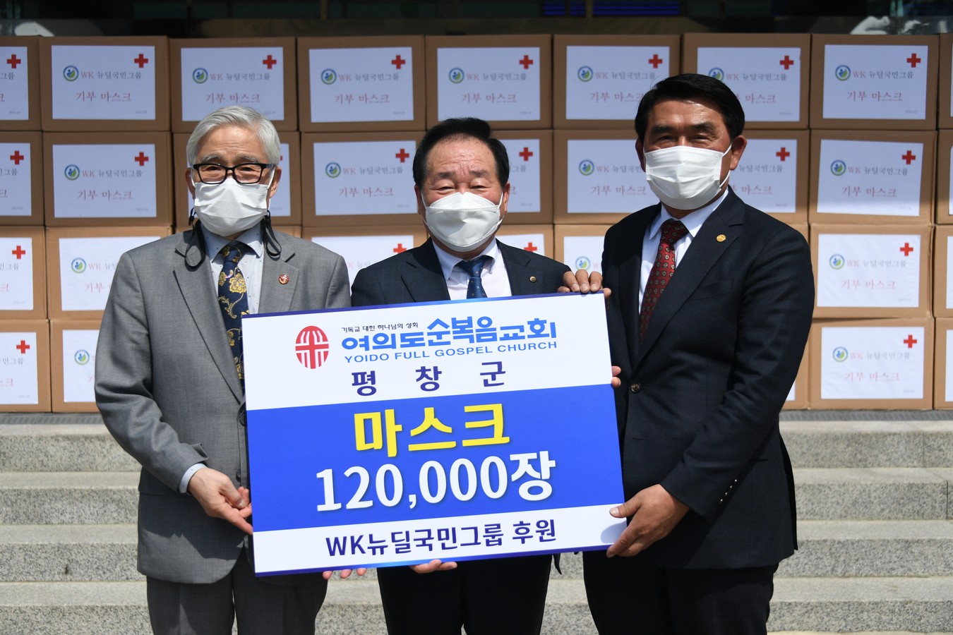 여의도순복음교회(당회장 이영훈 목사)가 박항진 WK뉴딜국민그룹 총재의 후원으로 마련한 마스크 12만장을 강원 평창군에 기탁했다.