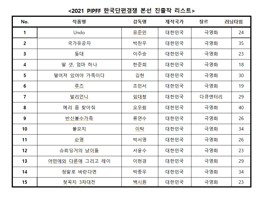 평창국제평화영화제가‘한국단편경쟁’출품작 606편 중 본선진출작 총 15편(극영화 14편, 다큐멘터리 1편)을 영화제 홈페이지를 통해 발표했다.