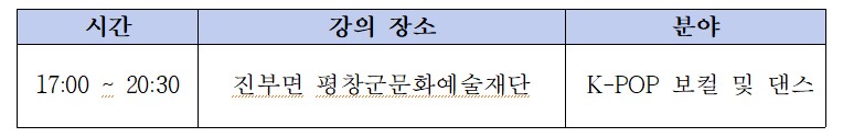 평창군문화예술재단에서는 전문적이고 체계적인 K-POP 프로그램 운영을 통해 평창 청소년들의 여가 활동을 돕고 청소년 아티스트로서 성장을 지원하고자 평창 청소년 K-POP 아카데미 수강생을 모집한다.